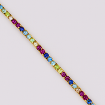 Ce bracelet tennis en argent 925 plaqué or séduit par son éclat et ses couleurs vibrantes. Serties de pierres aux teintes multicolores, chaque maillon reflète la lumière pour offrir un style unique, frais et sophistiqué.
