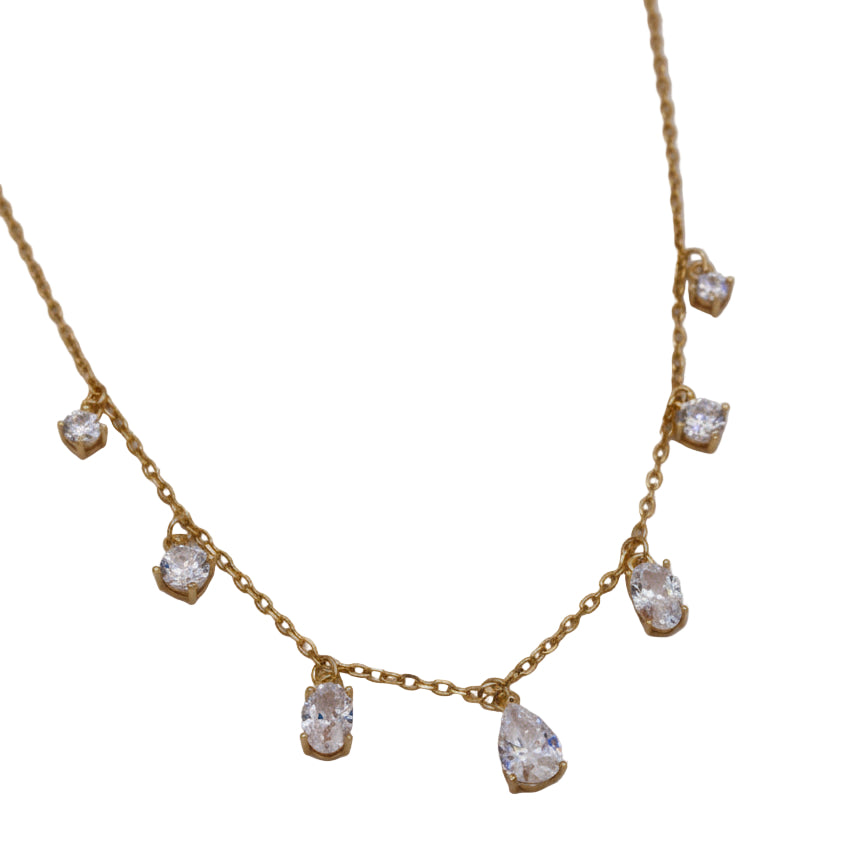 Ce collier raffiné en argent 925 plaqué or se pare de pampilles délicates serties de zircons scintillants. Son pendentif central en forme de goutte ajoute une touche de lumière et d’élégance à votre port de tête.